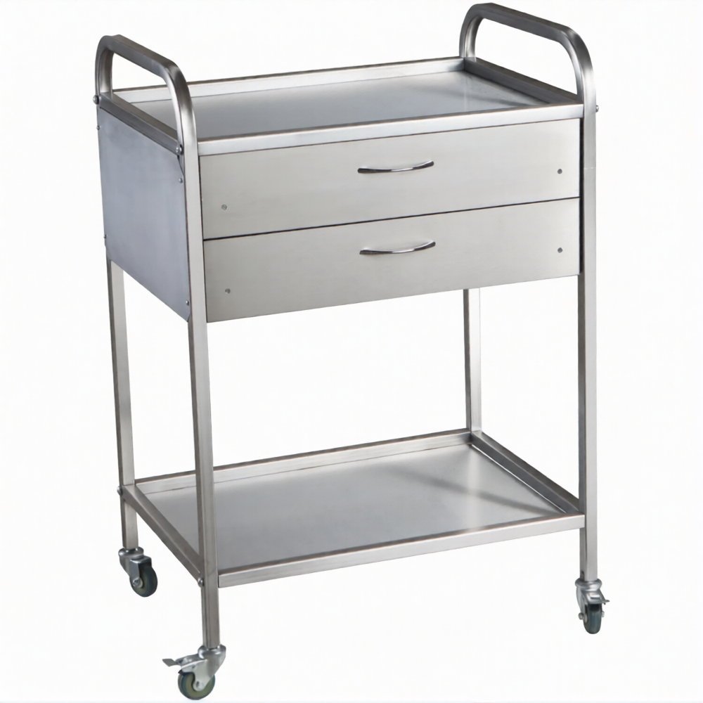 Стол медицинский инструментальный СМИ-02-02 (полки металл, колёса серая резина) предназначен для размещения инструмента, лекарственных препаратов и приборов.