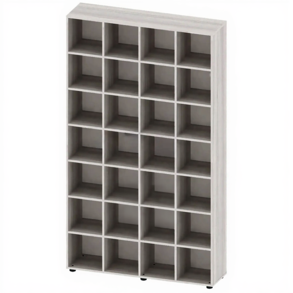 - Максимальная вместимость при компактных размерах — 28 ячеек, расположенных вертикально в несколько рядов, позволяют хранить огромное количество папок, коробок или документов на минимальной площади.