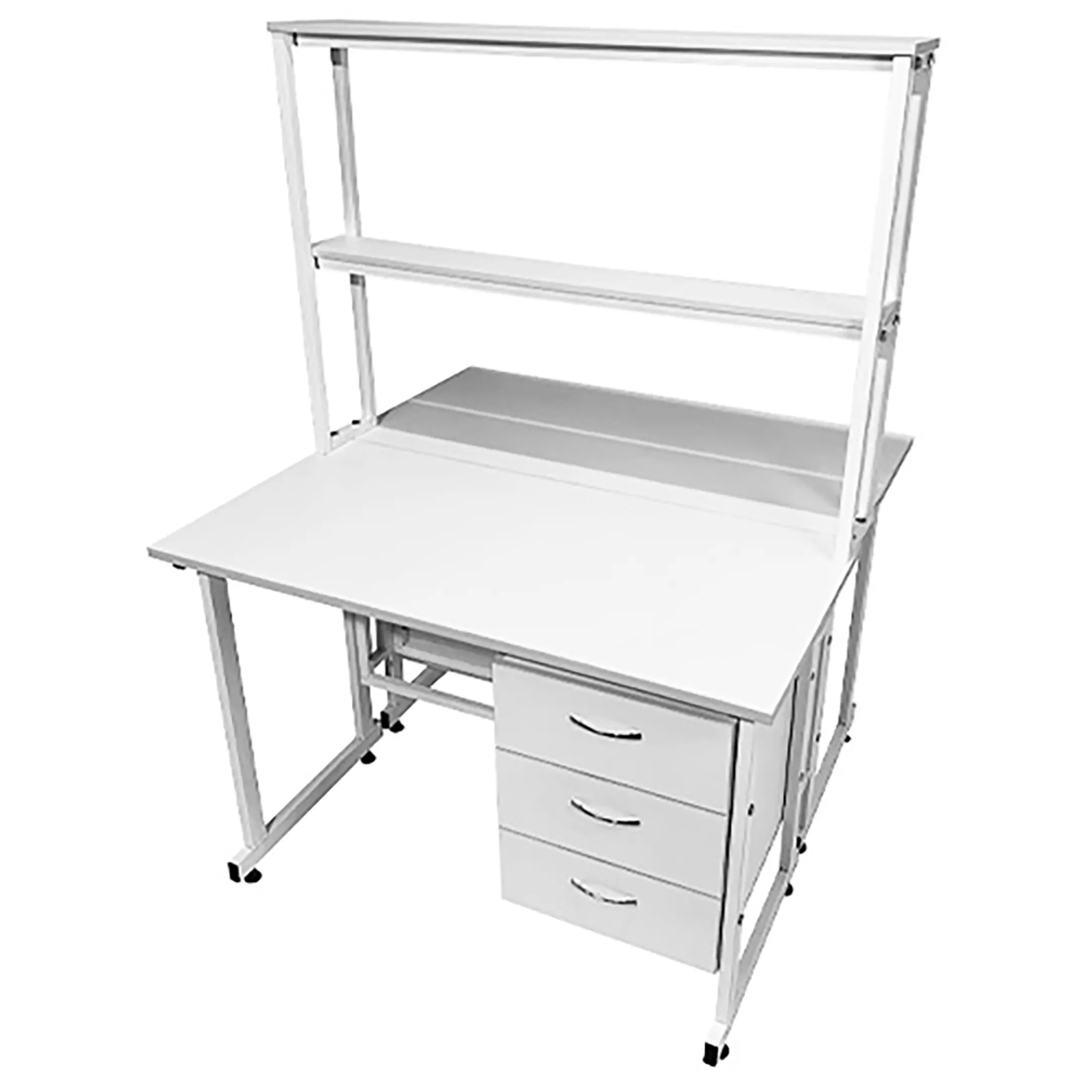 Стол лабораторный островной с надстройкой Сло 22.015 (белый) идеально подходит для создания двух функциональных рабочих мест в лабораториях и медицинских учреждениях. Модель оснащена двумя рабочими местами, каждое с подвесной тумбой с тремя выдвижными ящиками, и центральной надстройкой с двумя полками. Каркас выполнен из стального профиля, столешницы из ЛДСП толщиной 22 мм.