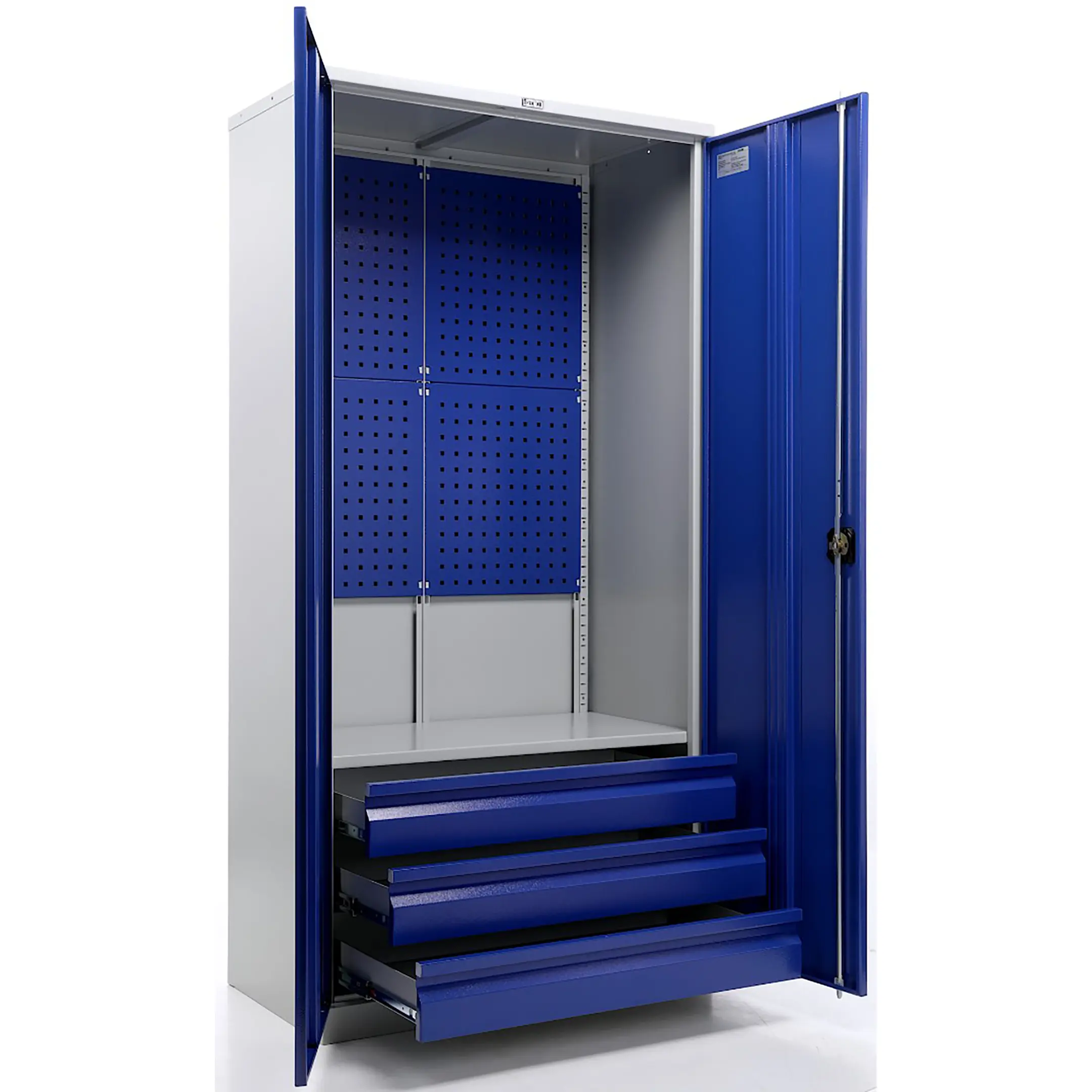 - Максимальная организация и наглядность — модель оборудована обширными перфорированными панелями (система «перфо») на дверцах и, как правило, на задней стенке. Это позволяет удобно, компактно и наглядно разместить огромное количество инструмента на крючках и держателях, обеспечивая мгновенный визуальный контроль его наличия и комплектности.