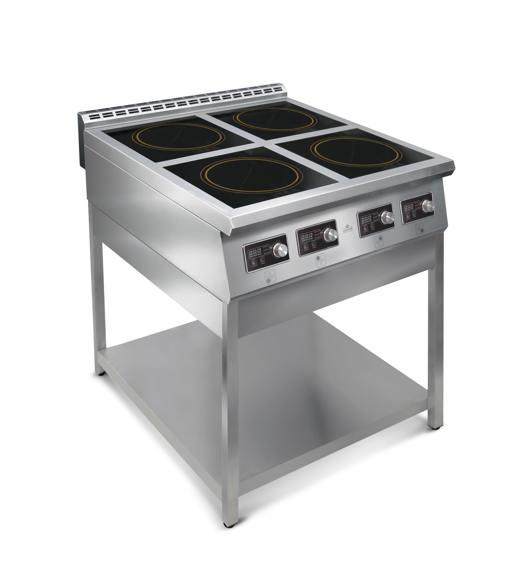 Индукционная четырехконфорочная плита с подставкой. Широкий диапазон управления мощностью позволяет обеспечить приготовление любых блюд, в том числе готовку особенно деликатных продуктов — соусов, яиц, молока, заварных кремов и т.п.