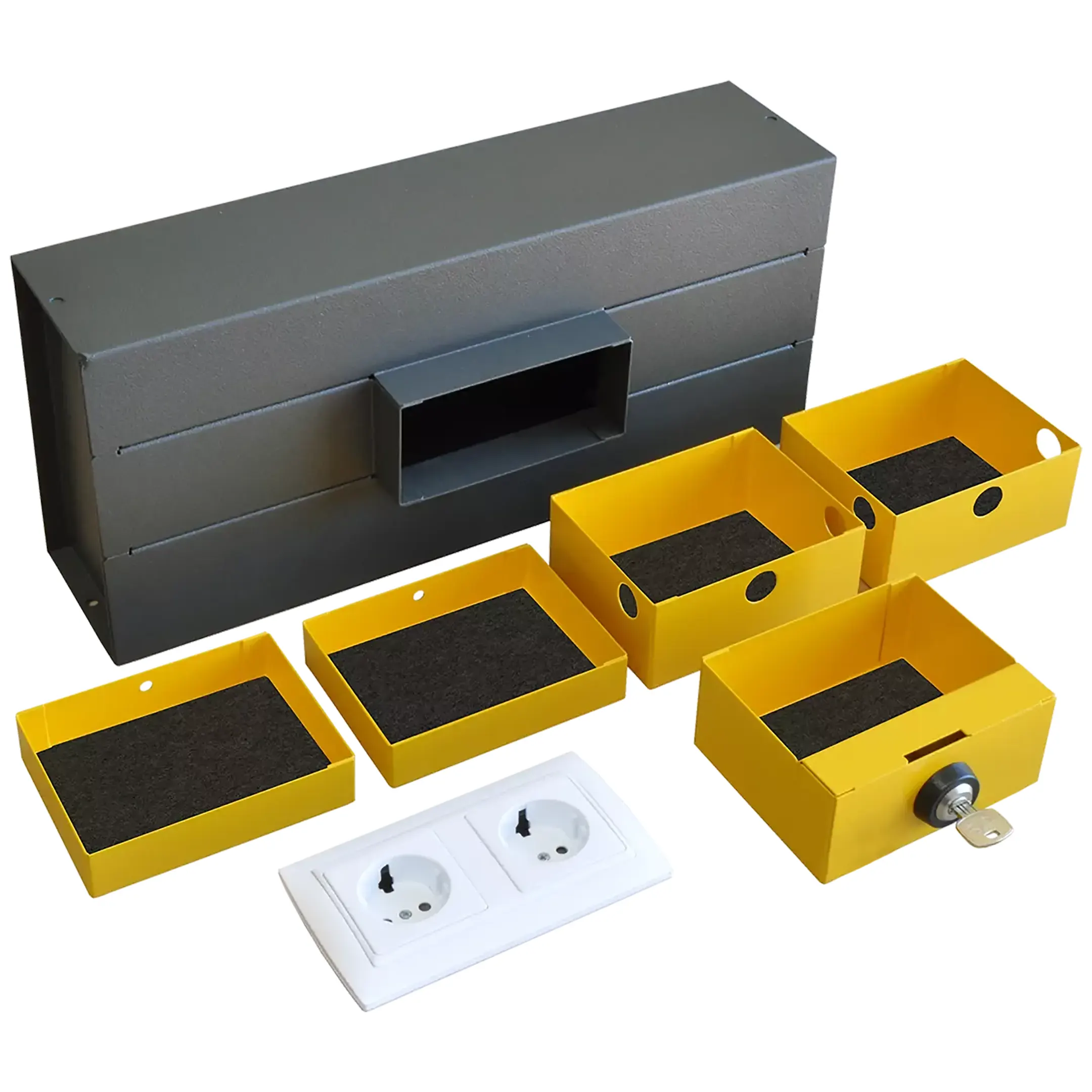 Уникальный сейф-невидимка с телескопическим регулированием высоты изделия (от 201 до 240 мм) под любую глубину стены или пола. Водонепроницаемая крышка для защиты от пыли и грязи особенно актуальна при расположении в полу. Объем 2,8 л.