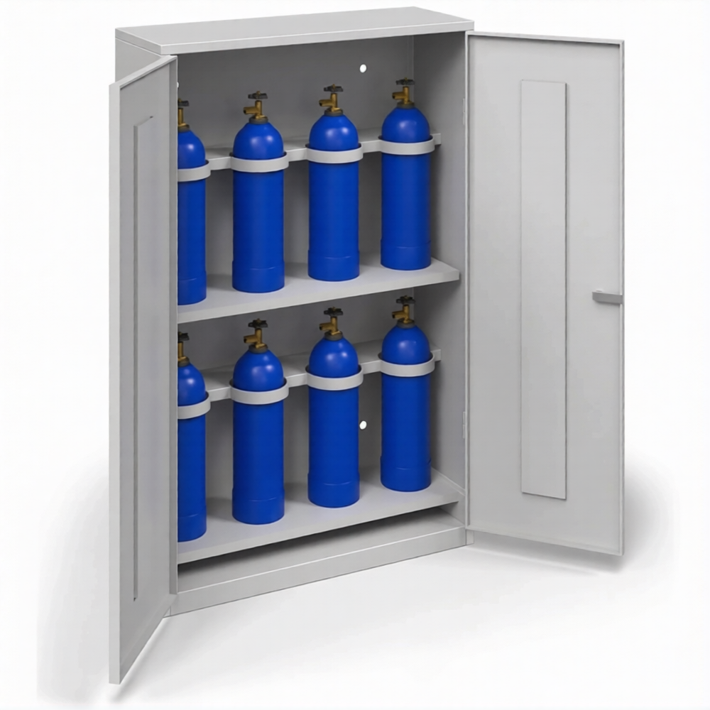 Шкаф для 8-ми газовых баллонов ШГБК-015 (1402x900x320) — это компактное, узкое и практичное решение для безопасного хранения и защиты газовых баллонов на производственных участках, в складских помещениях, мастерских и на объектах с ограниченной глубиной пространства. Модель представляет собой стальной защитный шкаф, где маркировка «ШГБК-015» указывает на его серию, а габаритные размеры 1402 мм (высота) х 900 мм (ширина) х 320 мм (глубина) определяют его нестандартную, узкую конструкцию для размещения до восьми баллонов в ряд. Такие пропорции разработаны для строгого соблюдения правил пожарной безопасности, обеспечивая защиту баллонов от внешних воздействий и несанкционированного доступа в условиях, где нельзя использовать шкафы стандартной глубины.