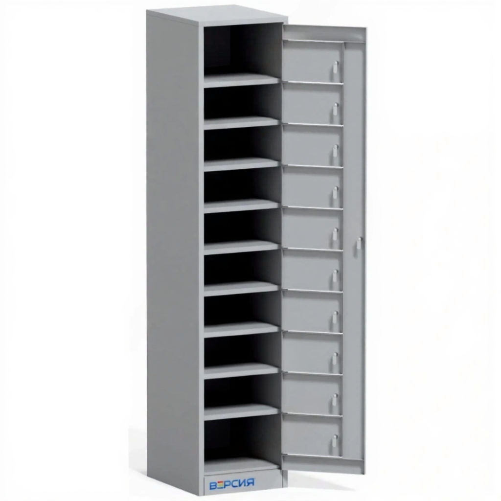Шкаф для личных вещей на 10 ячеек, общая дверца (1820х380х450) — это практичное и компактное решение для организации индивидуального хранения верхней одежды, сменной обуви, сумок и других личных вещей в школах, детских садах, спортивных секциях, офисах и производственных помещениях. Модель с десятью отдельными ячейками, закрывающимися общей дверцей, обеспечивает порядок, гигиену и сохранность вещей при экономии пространства.