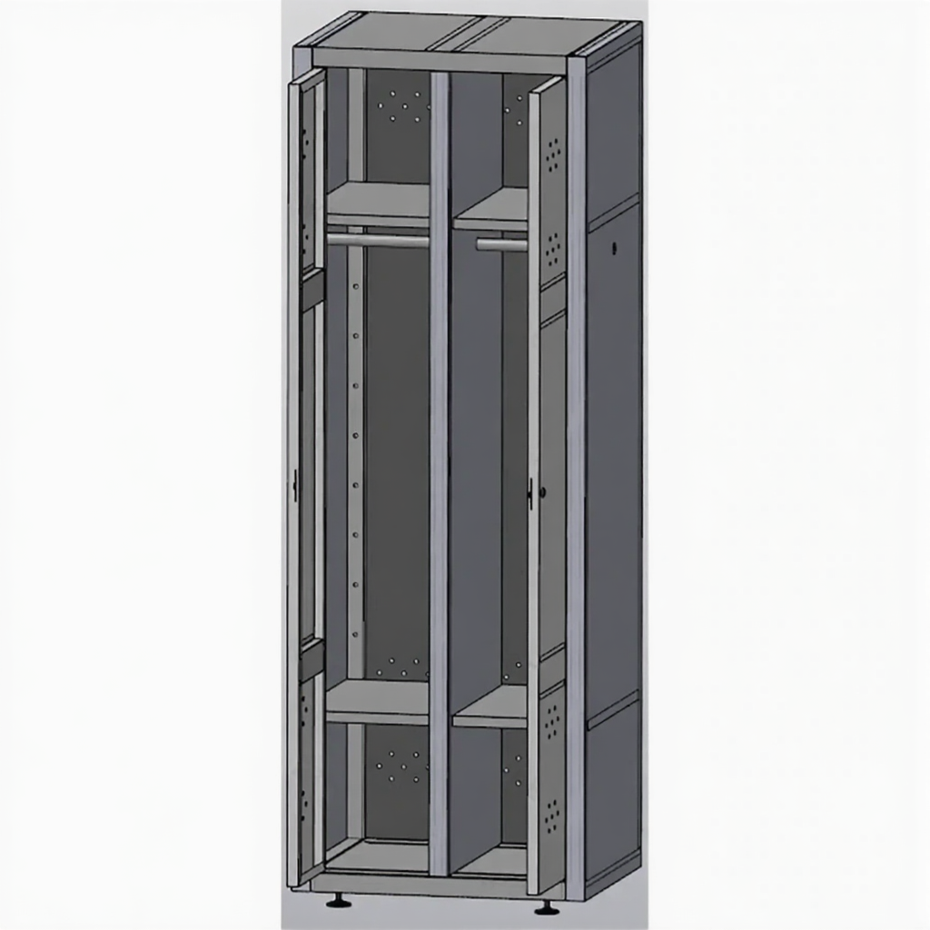- Эффективное разделение функциональных зон — шкаф конструктивно разделен на секцию для одежды (с крючками или штангой) и секцию для инвентаря (с полками, крюками для швабр). Это обеспечивает изоляцию чистой одежды от уборочных принадлежностей, что является обязательным требованием во многих учреждениях.