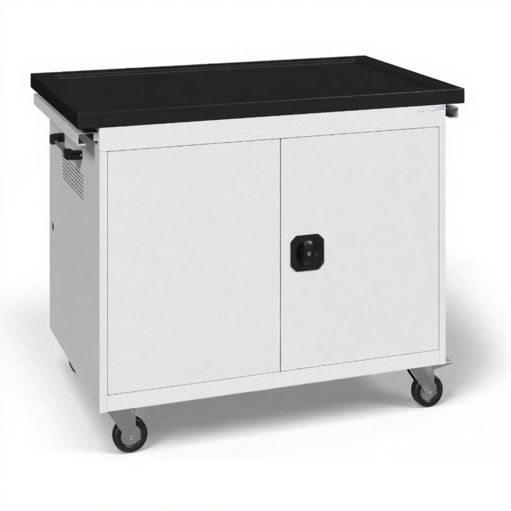 - Универсальность хранения — подходит как для ноутбуков, так и для планшетов популярного формата 15,6 дюйма, что позволяет использовать одну тележку для разного типа устройств в зависимости от потребностей.